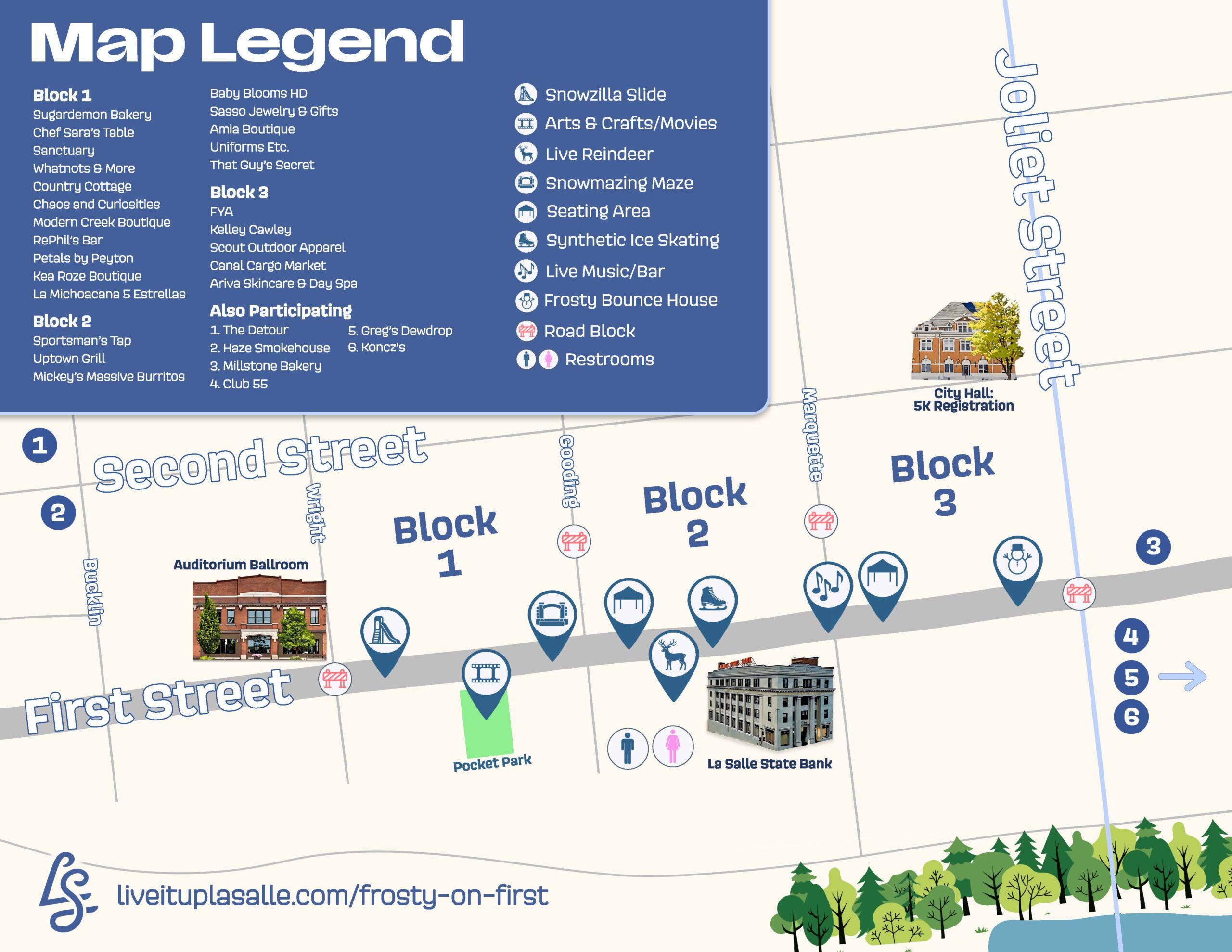 Please view the below Schedule of Events for all activities, including Face Painting sponsored by Eureka Savings Bank, Ax Church’s Ultimate Snowball Fight and Carnival Games, Kids Ornament Making and Letters to Santa Workshop sponsored by Advanced Sanitation, S’mores stations by La Salle Fire Department, and more!