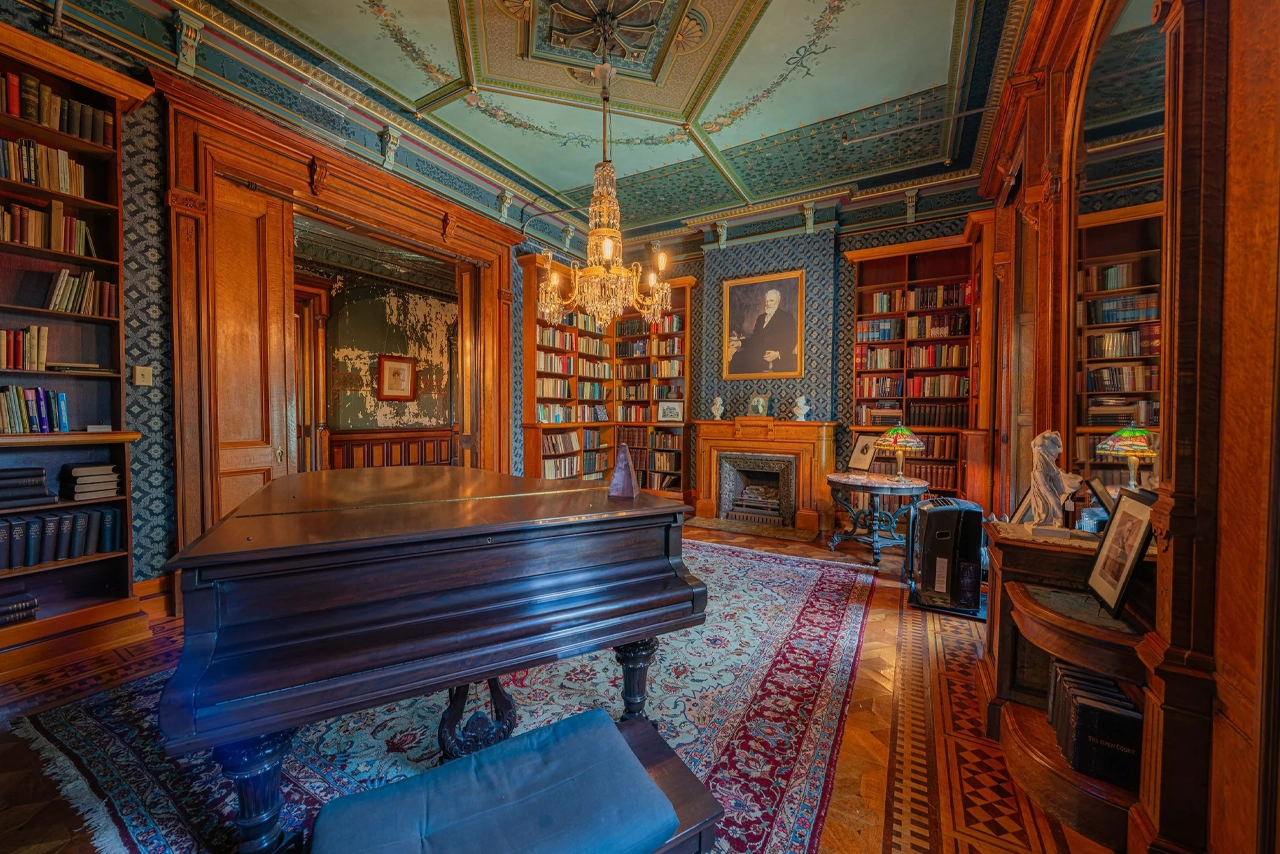 The Hegeler Carus Mansion was designed by W.W. Boyington, the same architect who built the iconic Chicago Water Tower, and was completed in 1876. Today, the structure remains virtually unaltered. The home boasts beautiful, intricate parquet floors and hand-painted ceilings, as well as ten beautiful fireplaces, of which several are marble